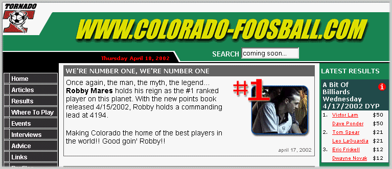 If you have a foosball website in Colorado and you want a link here, just email us.