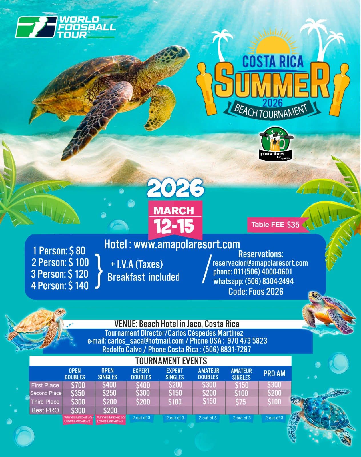 TD:Carlos Cespedes Martinez 970-473-5823(USA) Rodolpho Calvo 011-506-8831-7287(CR) World Foosball Tour email Costa Rica Summer Beach Tournament! were back again! dont miss it, beatiful scenery, paradise! great fun and times! |
