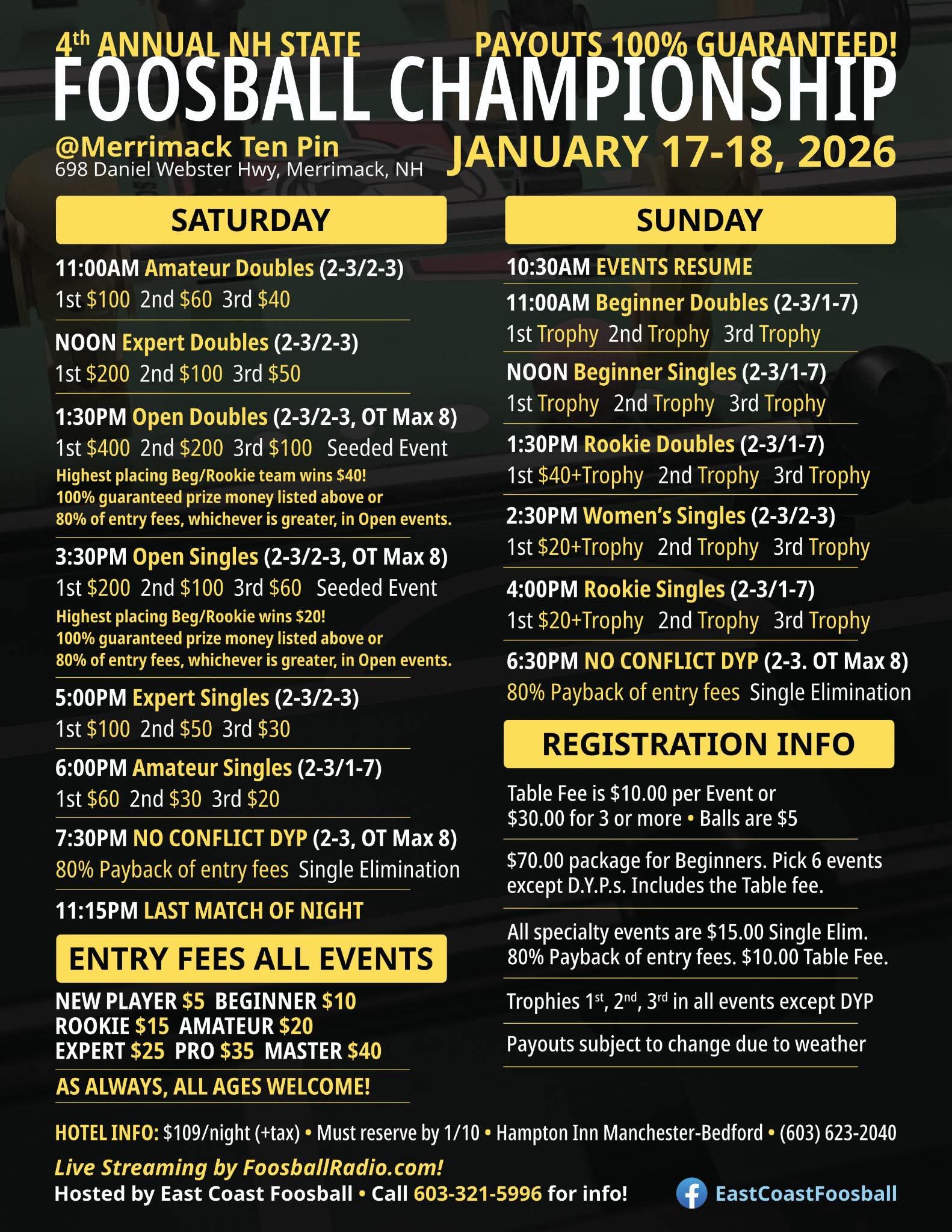 Ken Donahue 603-321-5996 EastCoastFoosball on Facebook live streaming by Foosballradio.com !!! |